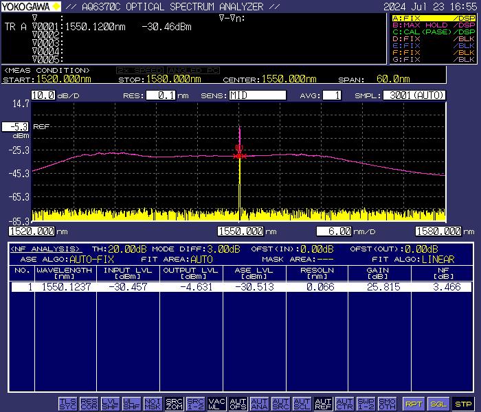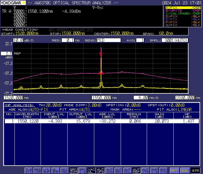 右图:输出功率110mW时的输出光谱@-3dBm输入,型号EDFA-C-BiD-BA-20-PM